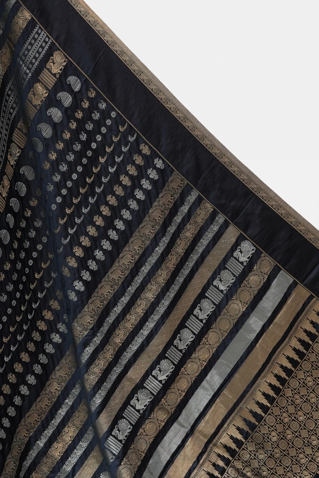 Colour :- Black Saree with Golden Zari & Multicolor Floral Design