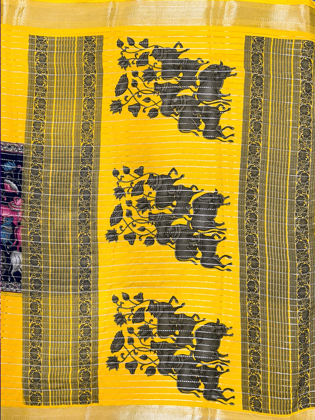 Semi-Crape Stripes & Printed Saree - Yellow Colour - QS208170