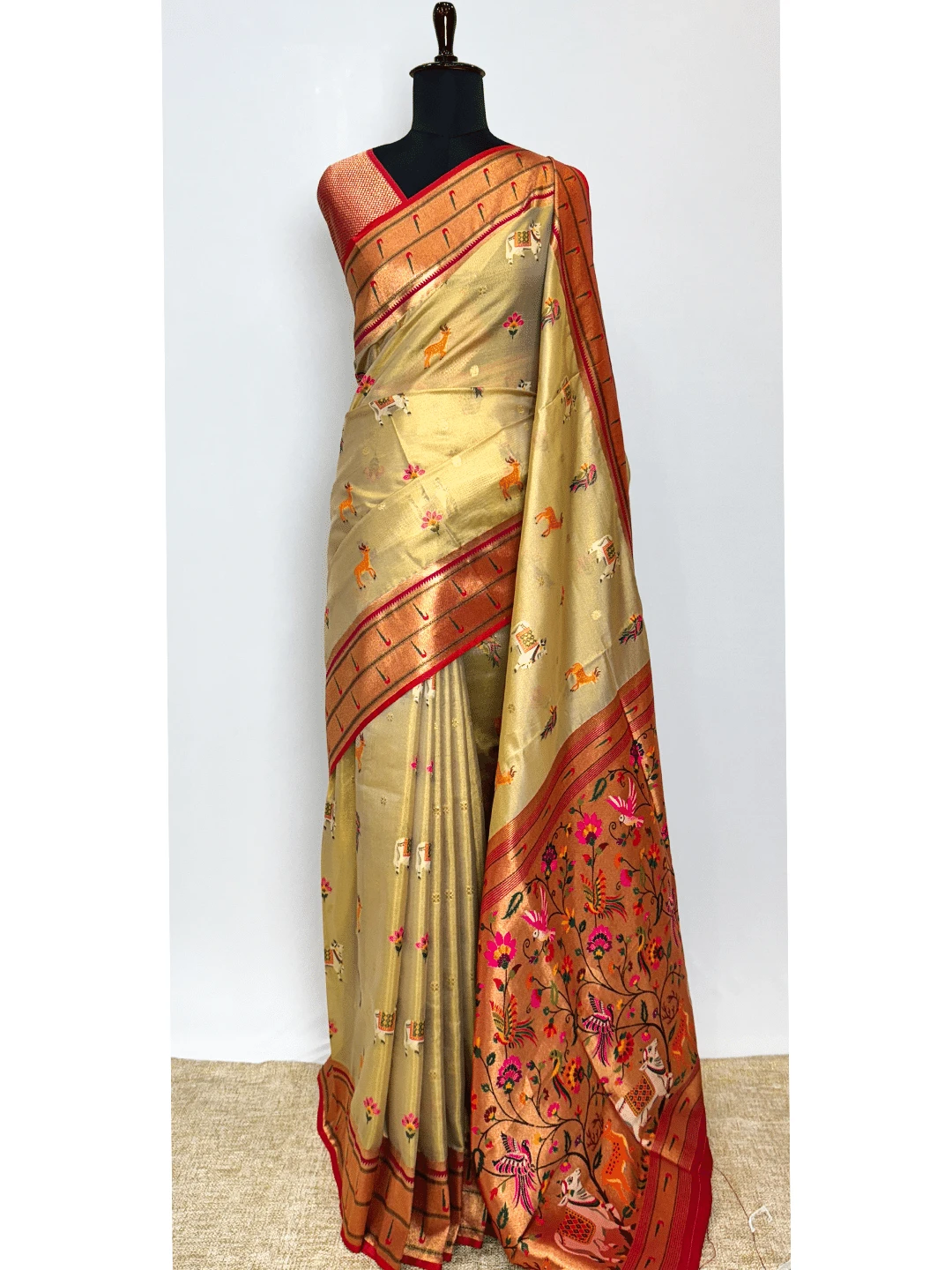 Tissue Paithani Saree - Gold With Red Colour - QS211700